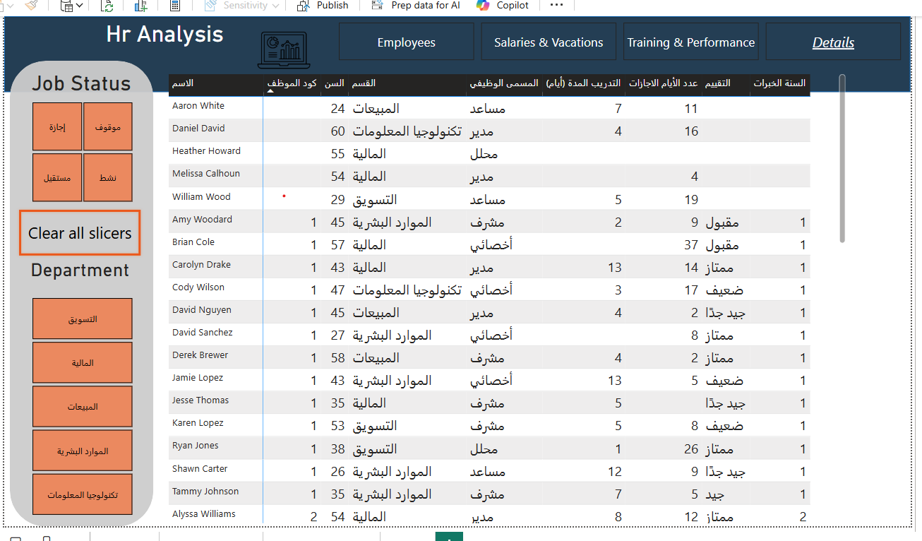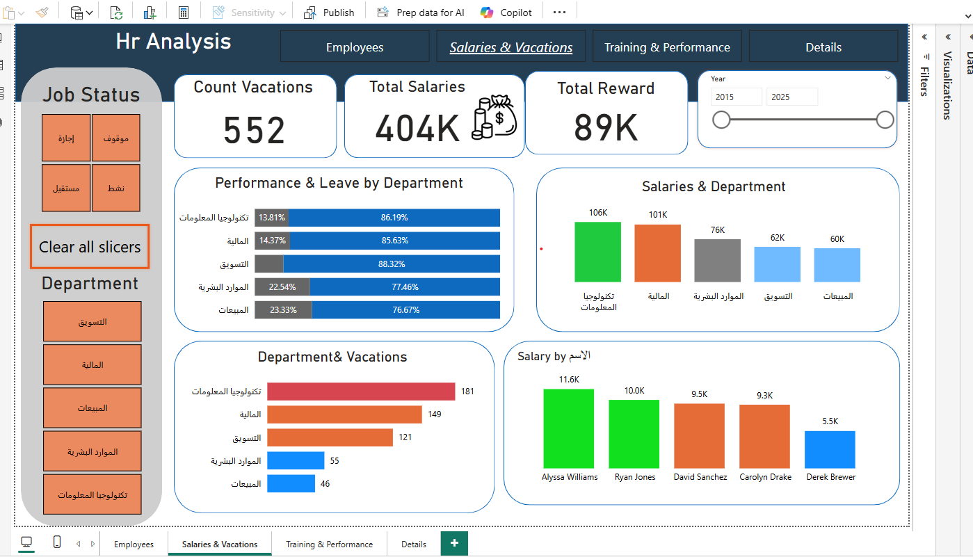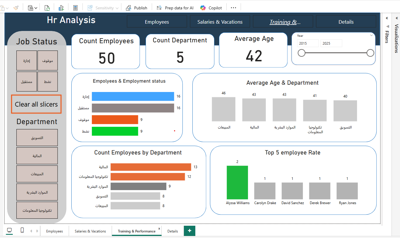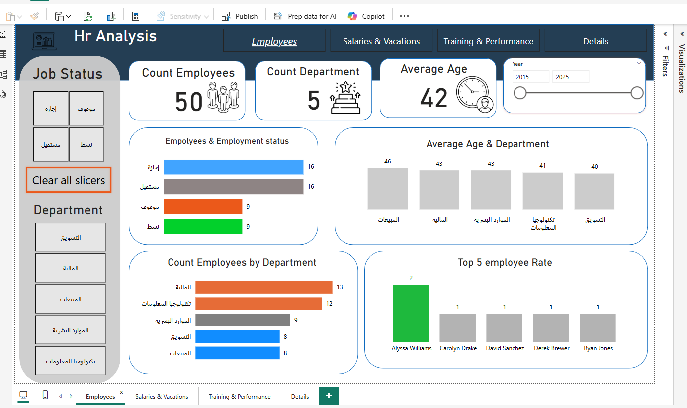 - Key HR KPIs: employee count, average salary, age, and experience.